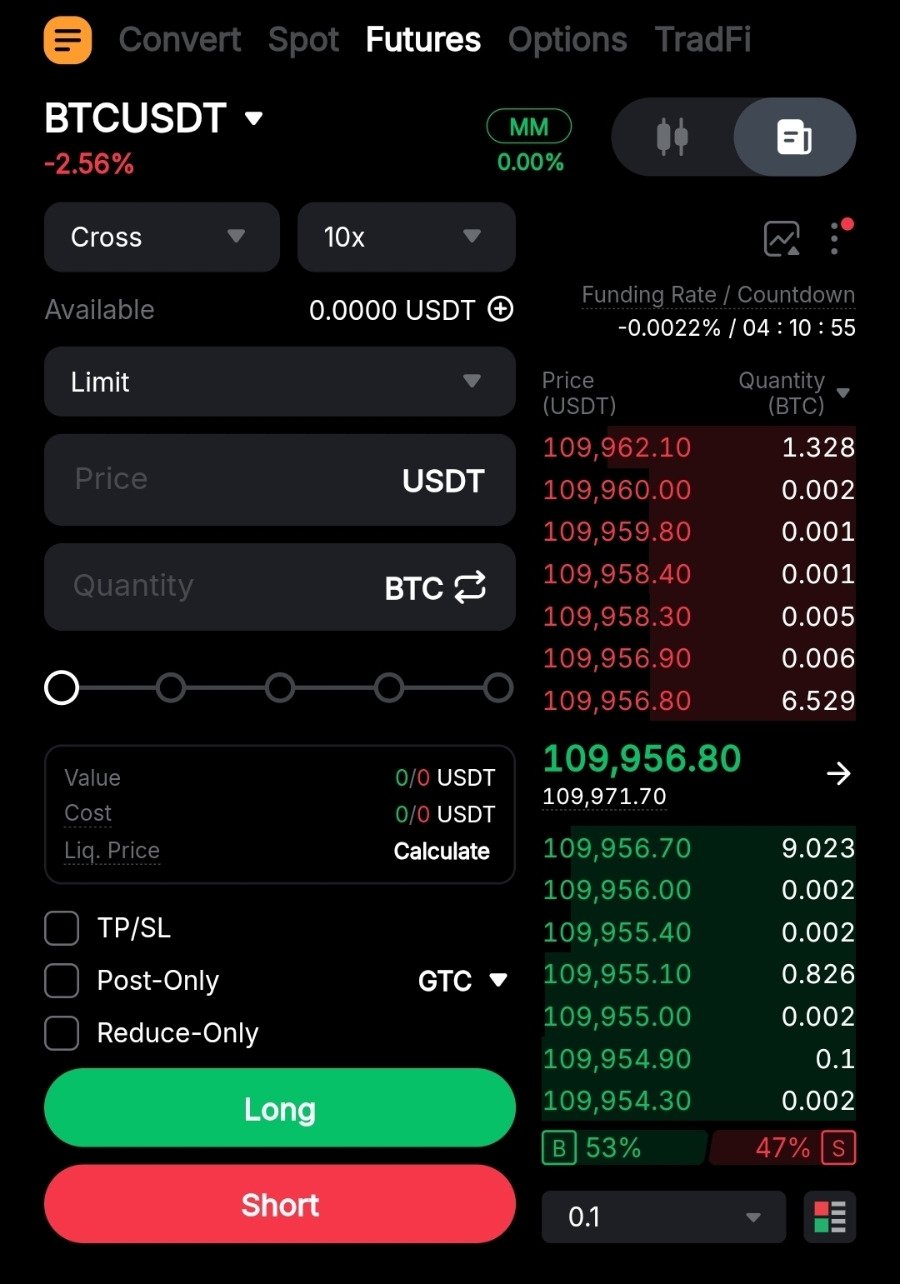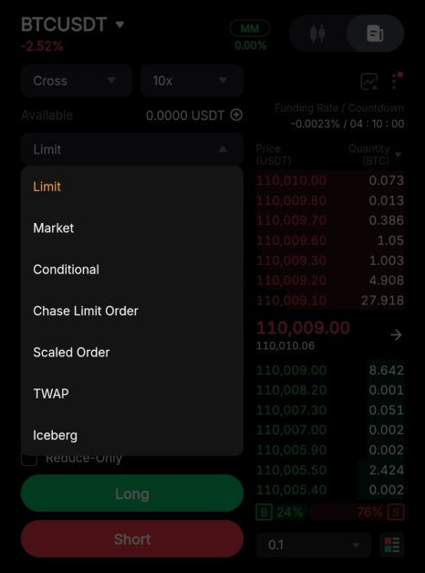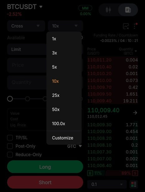 저는 BTCUSDT를 선택해 주었는데요. 가격상승-Long / 가격하락-Short을 선택해서 거래를 진행하면 됩니다. 레버리지라고 표현되는 거래배율은 1배부터 100배까지 선택할 수 있으나, 실제선물 거래에 대한 경험이 많지 않다면 청산이 진행될 수 있으니 저배율 부터 진행하시는게 좋습니다. 또한, 주문가격도 시장가, 지정가 등으로 선택할 수 있어 편리합니다.